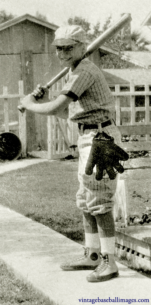 A backyard pose, with glove close at hand. I’ve blown up a detail of the boy below, as it’s a little hard to see the great glove in the full photo. I picture him heading off to a game right afterwards, though I am not actually sure how many leagues they had for kids at the time (Little League baseball began in 1939 with just three teams, and until 1947 was limited to Pennsylvania). There are many snapshots of boys from that era in uniform, and I assume that at times they were on actual teams, but suppose that in many cases they were just wearing uniforms they were given by their parents.