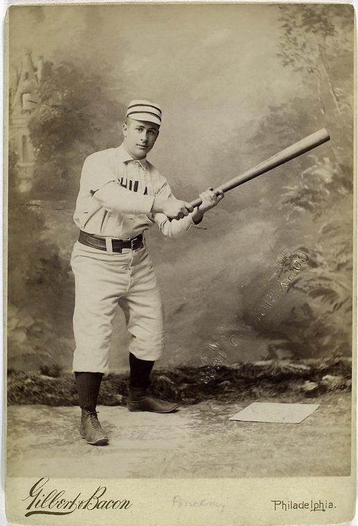 George Pinkney played major league baseball from 1884 to 1893, for teams such as the Cleveland Blues, Brooklyn Grays/Bridegrooms/Trolley Dodgers and the Louisville Colonels. He is the player whose record for most consecutive innings played (5,152, from 1885-1890) was broken by Cal Ripkin, Jr. in 1985. (Note that this was a different statistic than the consecutive-games record Ripkin set when he bested Lou Gehrig’s streak of 2,130 in 1995.) Interestingly, I have seen Pinkney listed as both a left- and right-handed hitter in different places (but not a switch hitter) — perhaps explaining (or explained by?) the photos from each side of the plate?